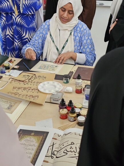 Their teacher for the day, Gulnaz Mehboob, was trained by the late Master Hasan Çelebi—widely respected as the Chief Master of Calligraphy (Reis ‘ul Hattatin). She guided students through the essential tools and techniques used in this ancient tradition.